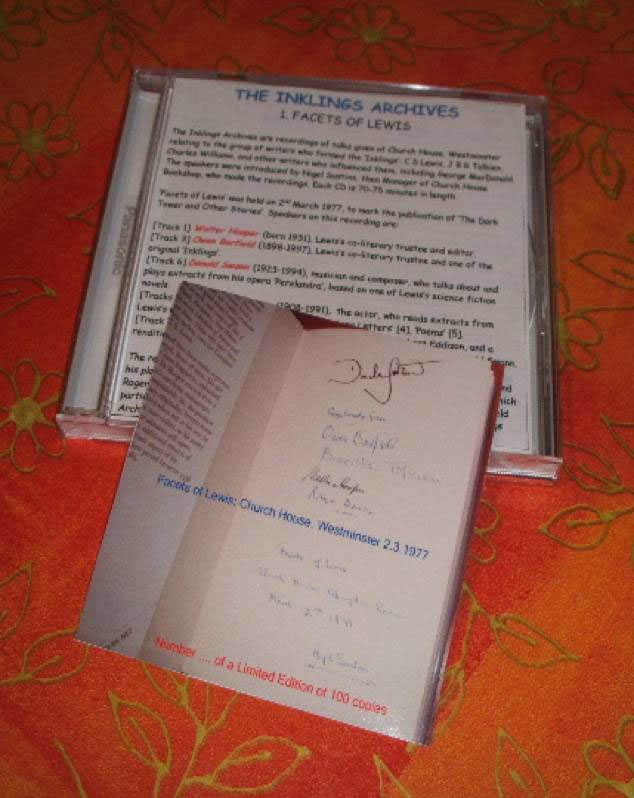 The Inklings Archives are recordings of talks given at Church House, Westminster between 1977-1983, relating to the group of writers who formed the ‘Inklings’: C S Lewis, J R R Tolkien, Charles Williams, and other writers who influenced them, including George MacDonald. The meetings were organised by Nigel Sustins, then Manager of Church House Bookshop, who made the recordings. Each CD is 70-75 minutes in length and cost 15 GBP.