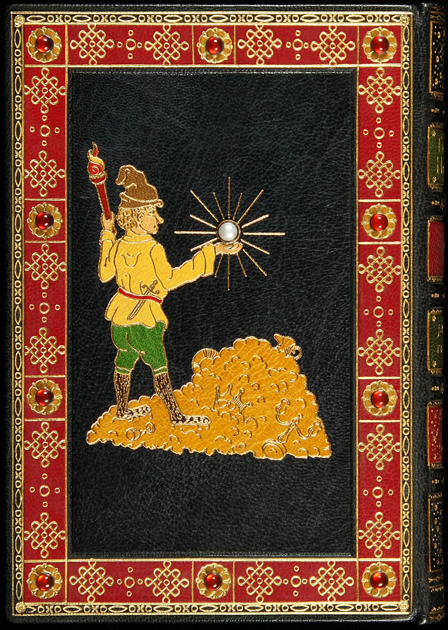 On the rear cover the Hobbit approaches the treasure, holding a torch and a pearl. Both covers have on-laid maroon and green borders decorated with Celtic interlace and lozenges in gilt, with 10 red jewels on small yellow floral on-lays. The spine, in six compartments separated by gilt tooled raised bands, shows four colored labels adorned with butterfly, spider, sword and dragon gilt tooling and a third white jewel.