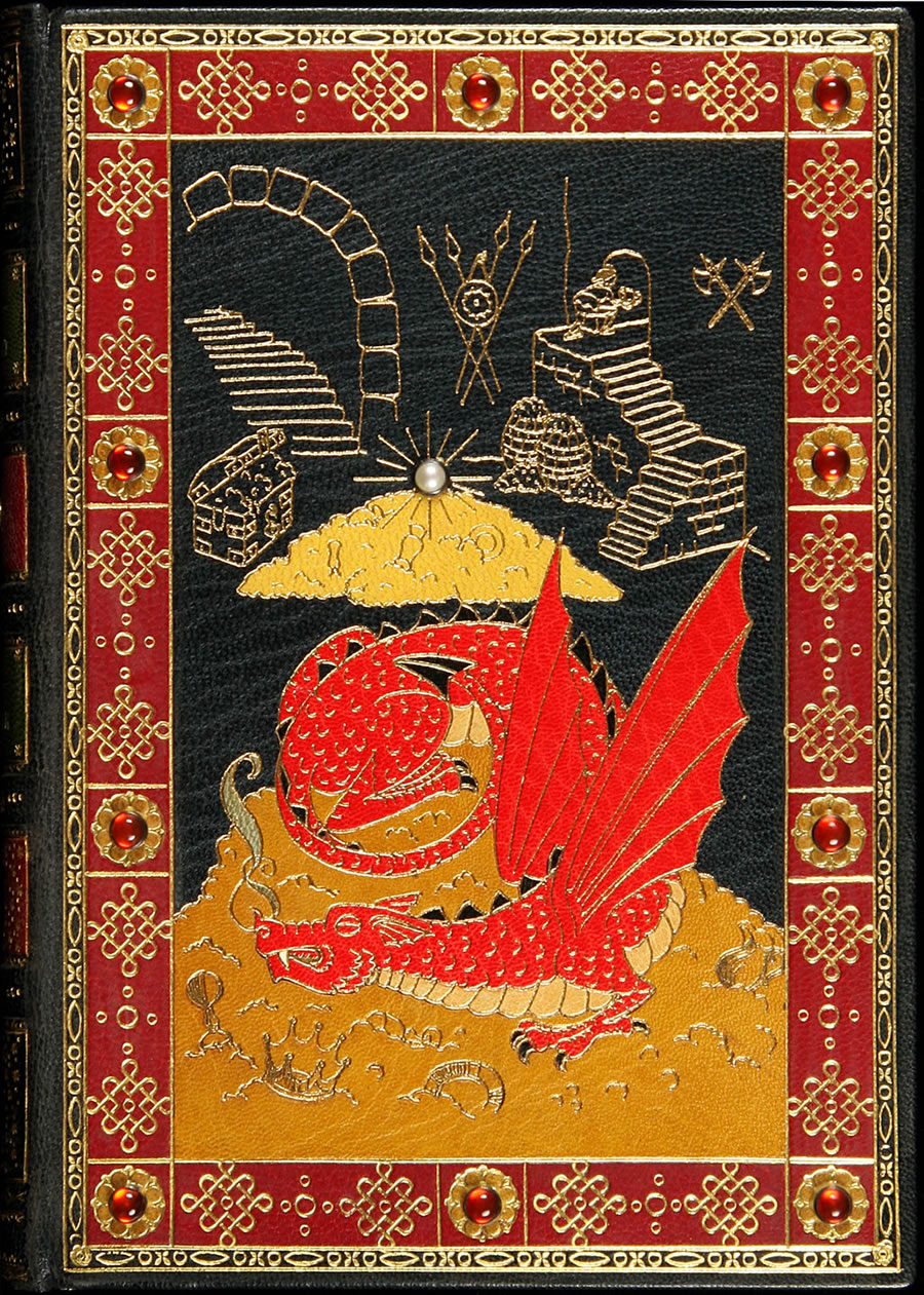 On the front cover, in a cave-fortress drawn in gilt, a sinuous red dragon guards piles of treasure surmounted by a radiant pearl (presumably representing the Arkenstone of Thrain).