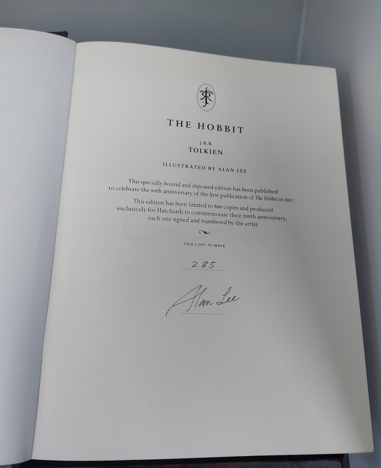 This listing is for an exclusive, signed limited edition of The Hobbit by J.R.R. Tolkien, published by HarperCollins in 1997 to celebrate the 60th anniversary of the first publication of The Hobbit. This edition is limited to just 600 copies, of which this is number 285. It was produced exclusively for Hatchards to commemorate their 200th anniversary and is signed by the renowned illustrator Alan Lee.